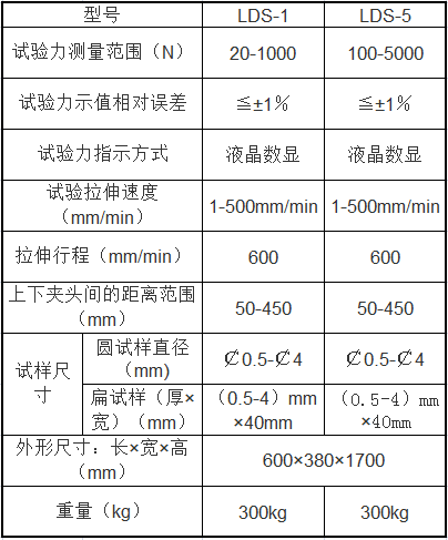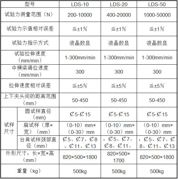 目前本公司有LDS-1、LDS-5、LDS-10,LDS-20,LDS-50多種型號(hào)電子拉力試驗(yàn)機(jī),也可根據(jù)客戶要求定制。